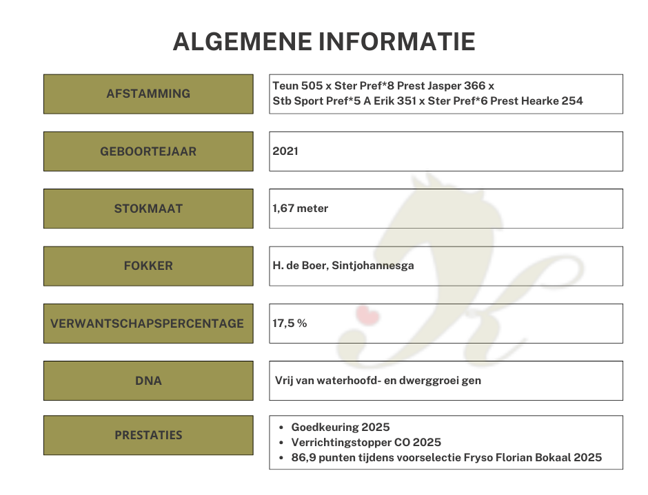 Sicco 550, geboren als Sicco fan de Kadyk, dat maakt het extra bijzonder. Moeder is Kroonjuweel Tooske fan de Kadyk Ster Preferent Prestatie (Jasper 366 x Erik 351). De nakomelingen hebben al uitstekende resultaten